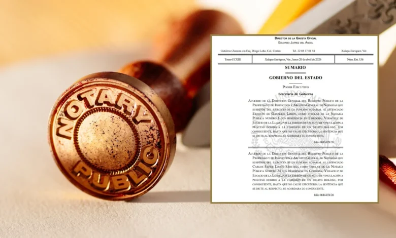 La Gaceta Oficial del Estado de Veracruz número 156 informó sobre la suspensión de ambos notarios, quienes enfrentan cargos por presunto fraude en perjuicio de la procuración y administración de justicia, así como del patrimonio. La medida se tomó después de que el juez de Primera Instancia adscrito al Juzgado de Proceso y Procedimiento Penal Oral del Distrito Judicial de Córdoba, Andrés García Velazco, emitió un oficio que notificaba la situación jurídica dentro del proceso penal 344/2024. La Dirección General del Registro Público de la Propiedad y de Inspección y Archivo General de Notarías recibió este documento el 8 de abril del mismo año, lo que llevó a la suspensión de los notarios.
