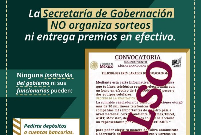 “La Secretaría de Gobernación NO organiza sorteos ni entrega premios en efectivo”, indicó la institución en su aviso difundido el 8 de abril.