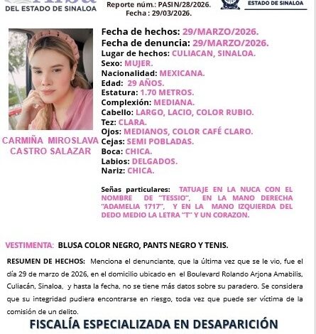 Según los primeros reportes, Castro Salazar fue hallada en el sector oriente de Culiacán y se encuentra en buen estado de salud.