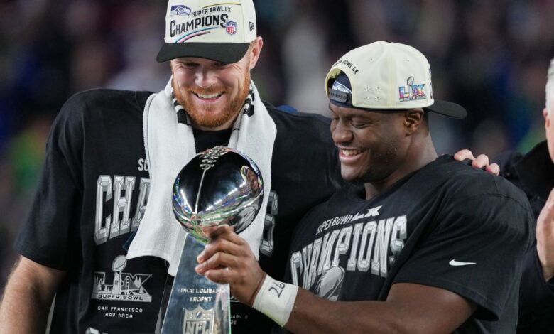 Kenneth Walker III y Sam Darnold celebraron este lunes el triunfo de los Seattle Seahawks en el Super Bowl LX de la NFL en el desfile que año con año se realiza en Disneyland.