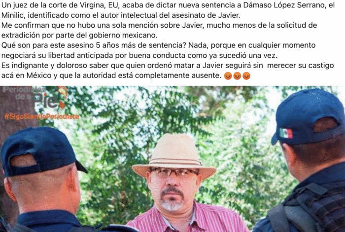 A través de una publicación en redes sociales, Triana señaló que durante la imposición de la sentencia no se mencionó el asesinato de Javier Valdez, ni tampoco se abordó la solicitud de extradición por parte del gobierno mexicano.